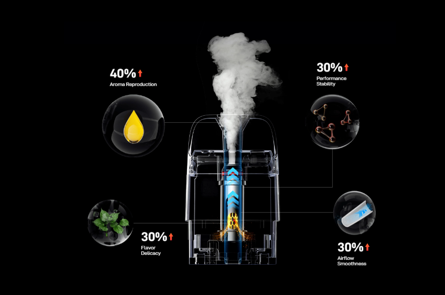 Nova malha Hive Mesh e design de chaminé aprimorado para 40% mais reprodução de aroma e 30% mais estabilidade e suavidade na tragada.