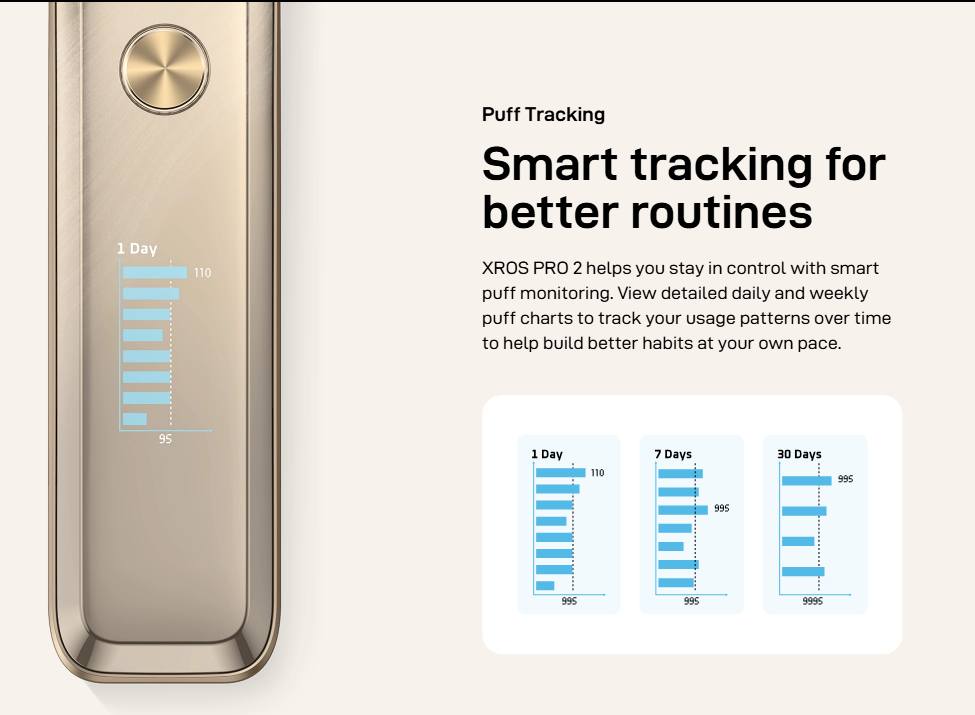 Rastreamento inteligente de tragadas diárias e semanais para maior controle.